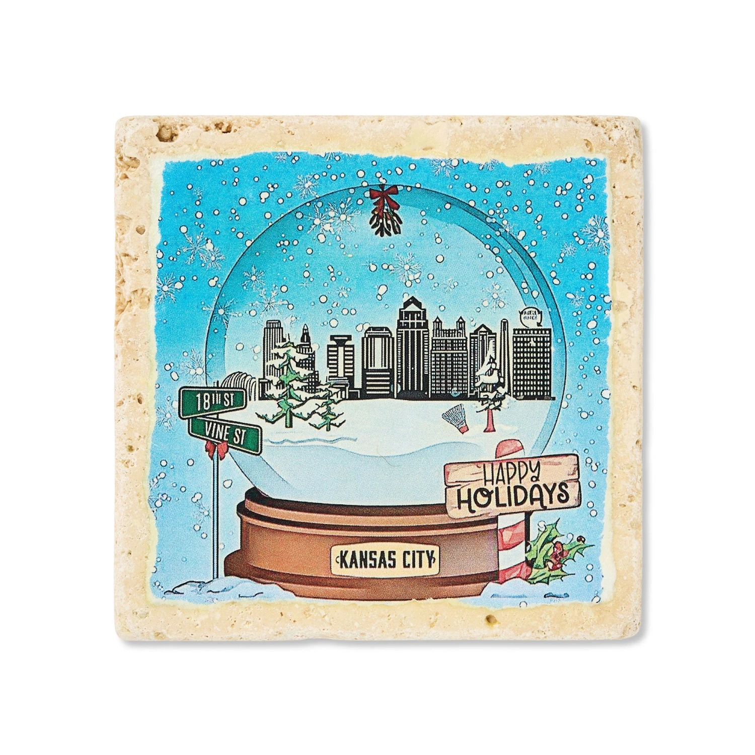 Limited edition holiday coaster! Featuring the city skyline inside a snow globe design. Image is on a stone tile with cork backing.