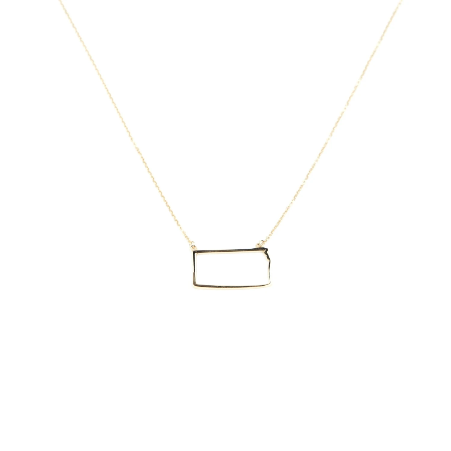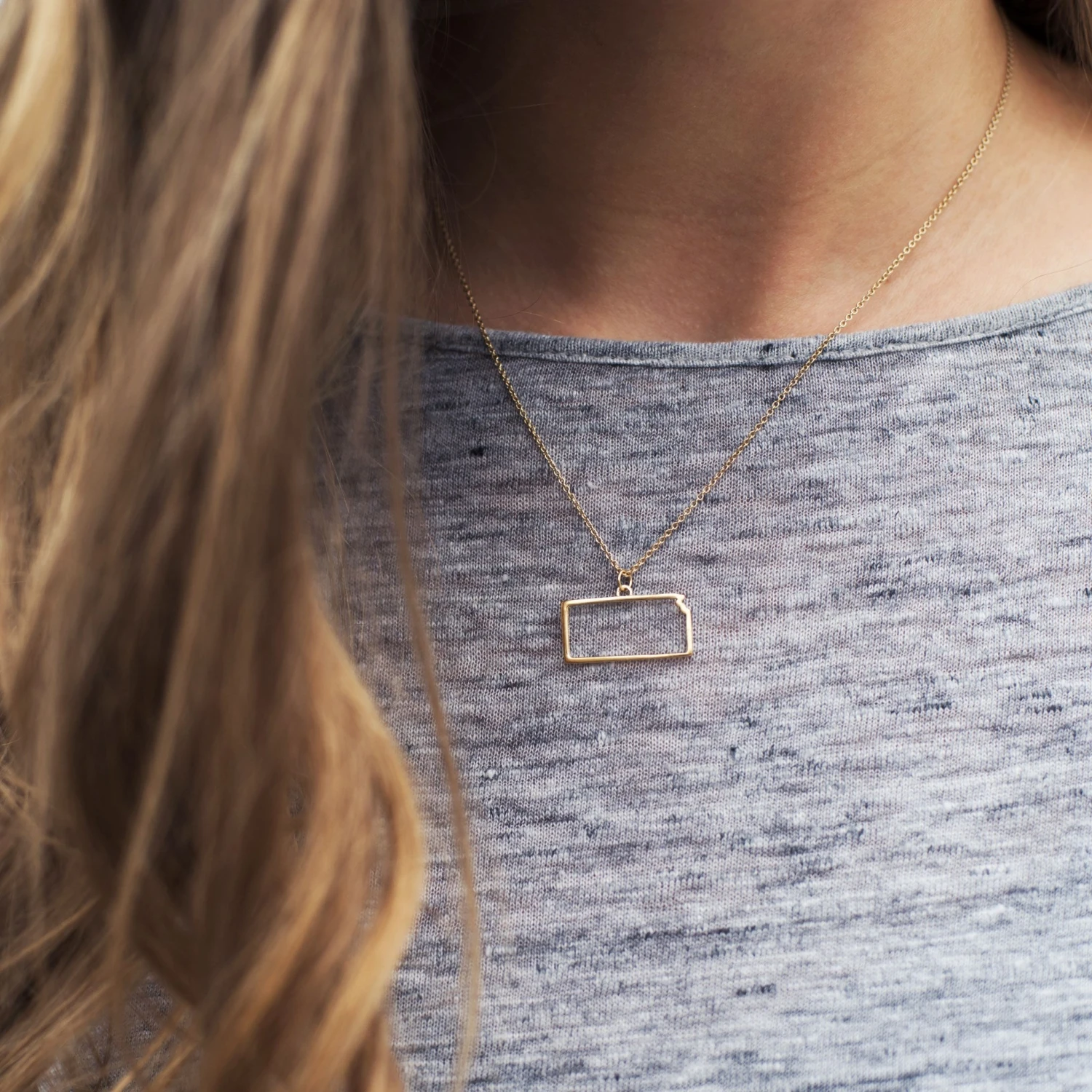 Available plated with 22k polished yellow gold or polished sterling silver finish. State is on a 18″ chain.