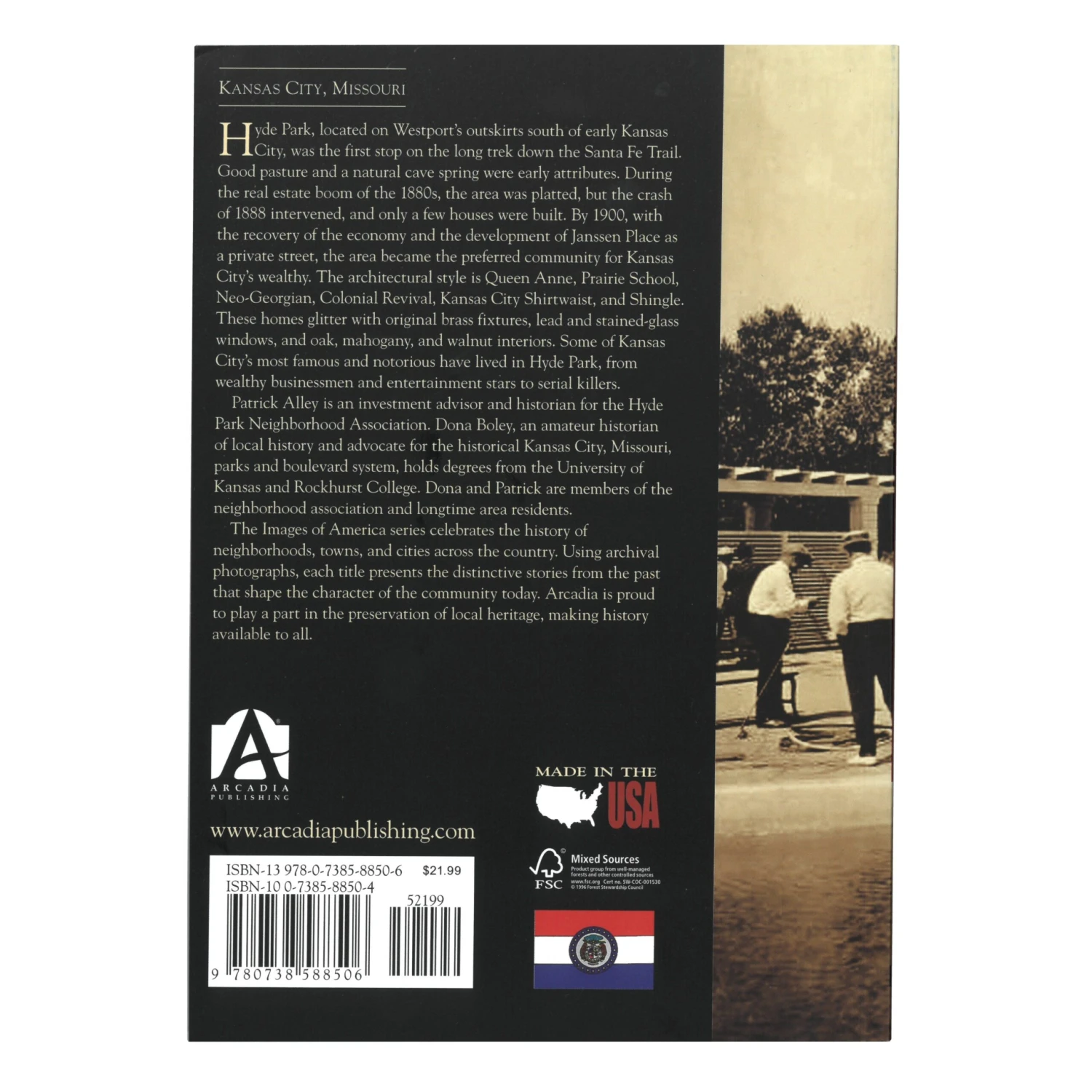 “Hyde Park, located on Westport’s outskirts south of early Kansas City, was the first stop on the long trek down the Santa Fe Trail. Good pasture and a natural cave spring were early attributes. During the real estate boom of the 1880s, the area was platted, but the crash of 1888 intervened, and only a few houses were built. By 1900, with the recovery of the economy and the development of Janssen Place as a private street, the area became the preferred community for Kansas City’s wealthy. The architectural style is Queen Anne, Prairie School, Neo-Georgian, Colonial Revival, Kansas City Shirtwaist, and Shingle. These homes glitter with original brass fixtures, lead and stained-glass windows, and oak, mahogany, and walnut interiors. Some of Kansas City’s most famous and notorious have lived in Hyde Park, from wealthy businessmen and entertainment stars to serial killers.” – From back cover