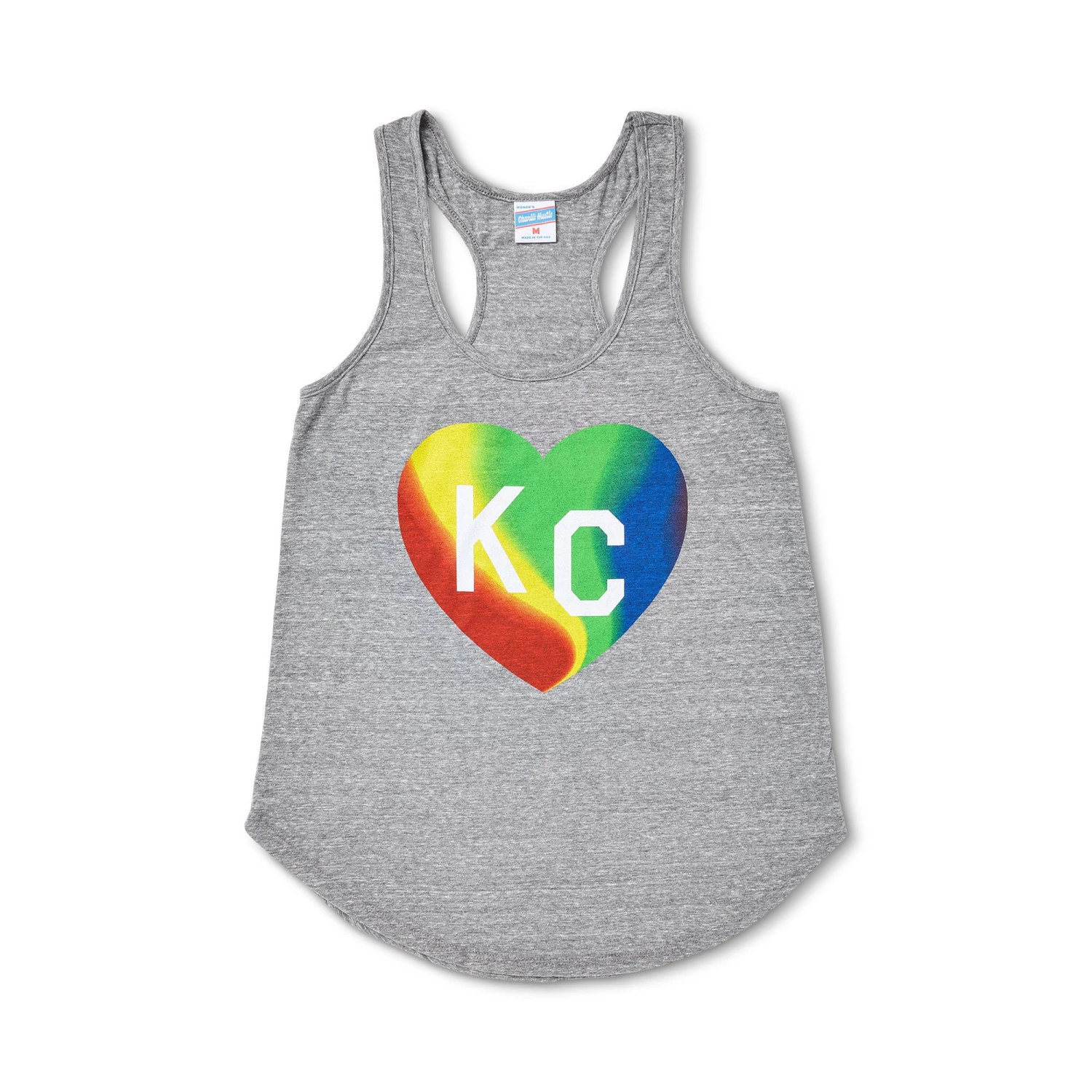 Grey racerback tank with ombre rainbow KC Pride heart from Charlie Hustle.