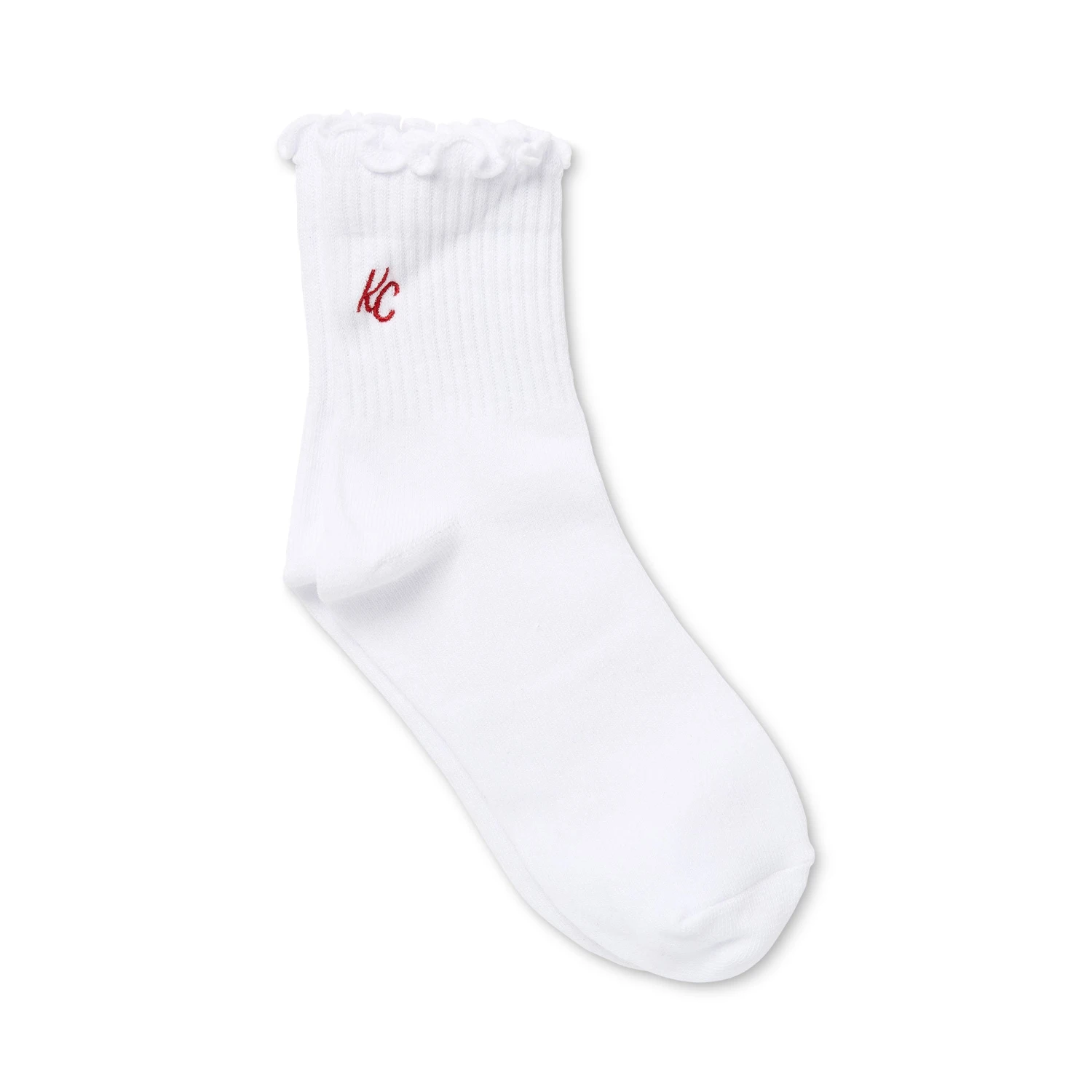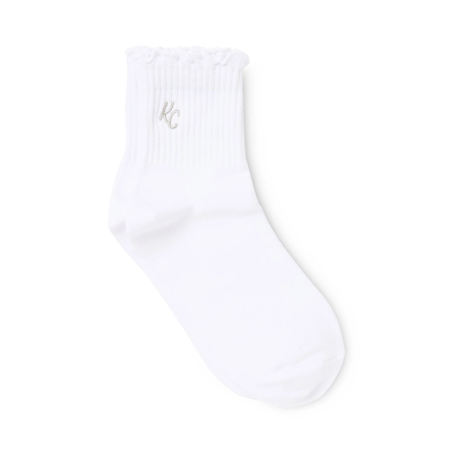 Powder blue ruffle socks with royal blue embroidered “KC” from Carly Rae. The perfect accessory for Kansas City baseball season!
