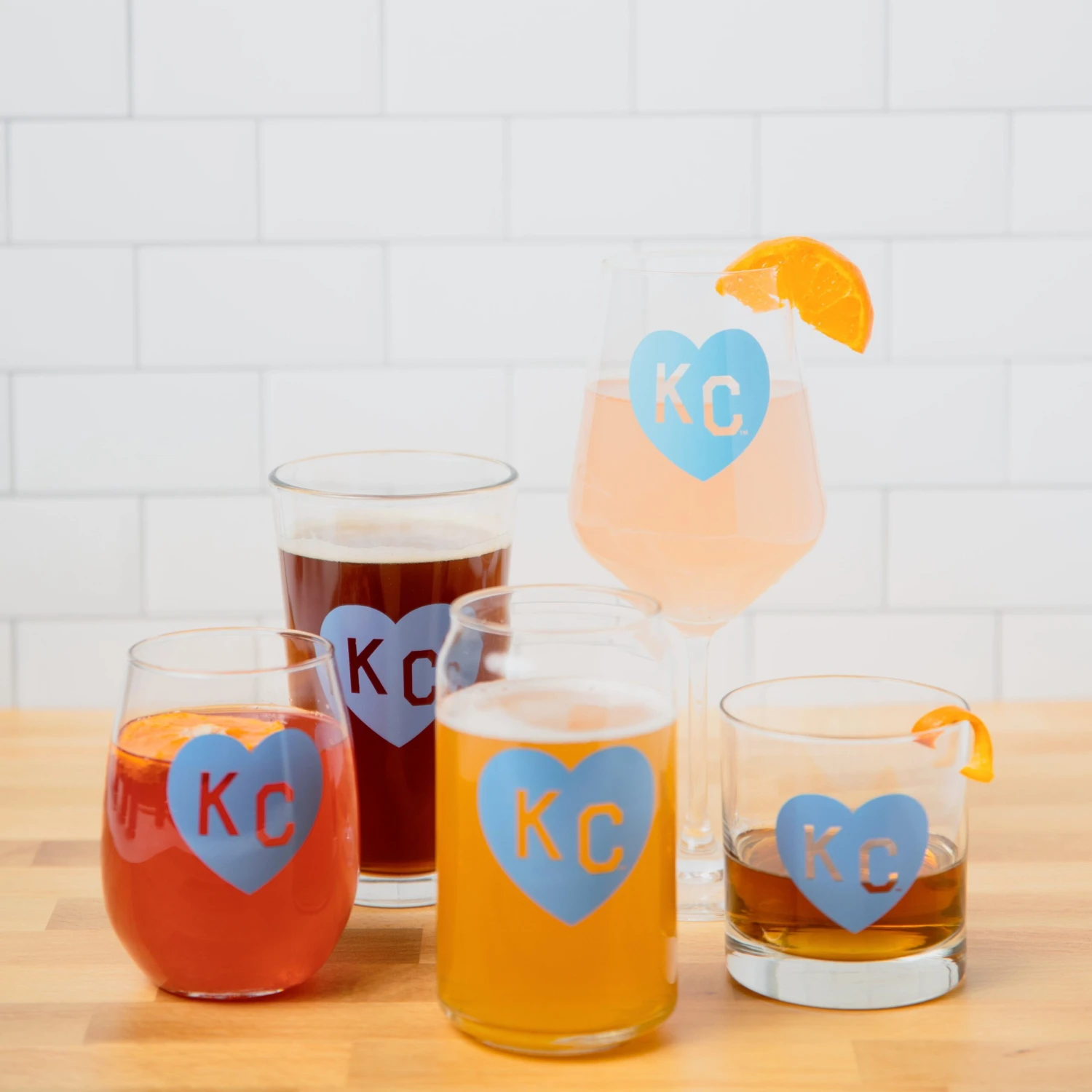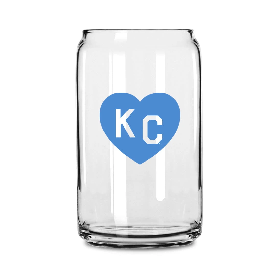 Exclusive glassware by Made in KC x Charlie Hustle featuring the iconic heart design. This light blue beer can glass a must-have on your shelf!