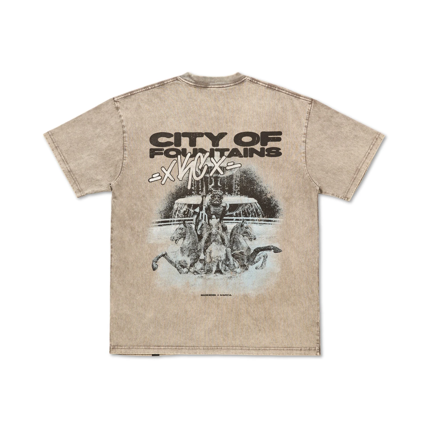 MADE MOBB City of Fountains Tee, with a cool minimal front and a large back picture detail of the Plaza Fountain.