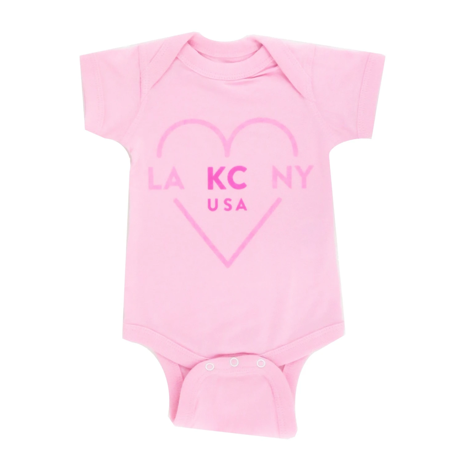 Adorable pink onesie from Ocean & Sea in their iconic design that celebrates Kansas City as the heart of the U.S.A.