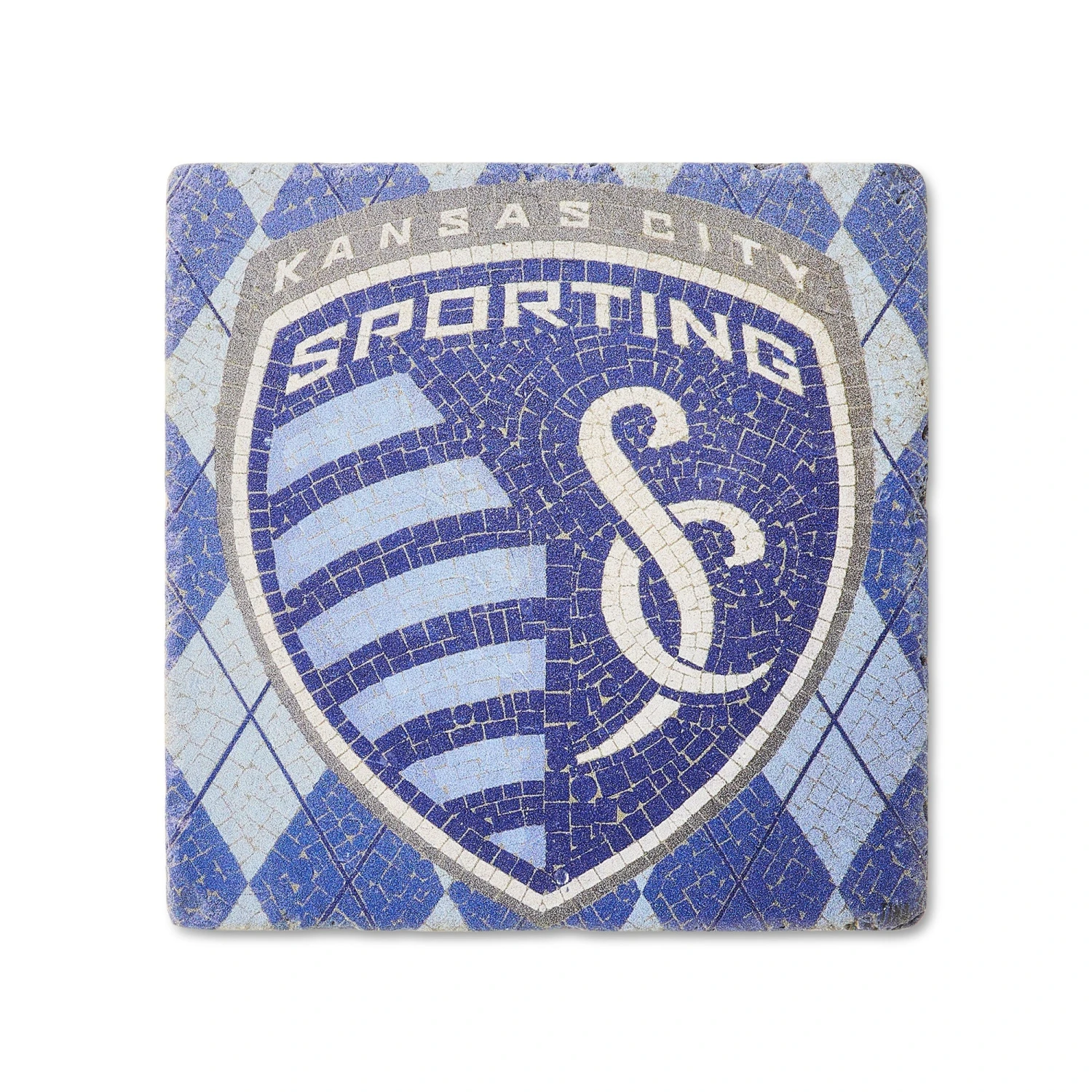 Kansas City coaster featuring the Sporting KC Shield in a mosaic design. Image is on a stone tile. Felt pieces on corners to prevent surface scratching.