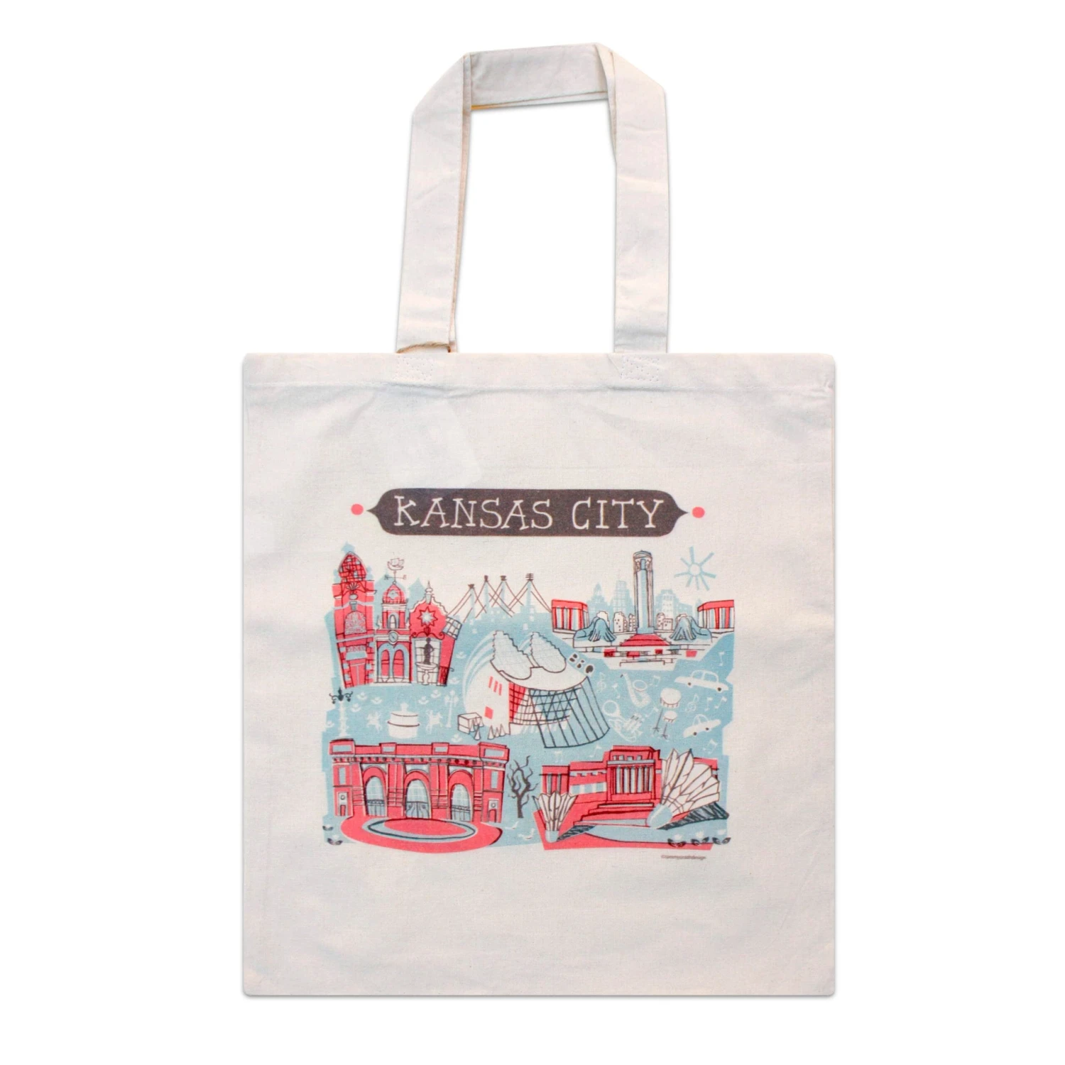 Colorful design featuring some of Kansas City’s most loved landmarks, including the Kauffman Center, Nelson Atkins Museum, and Union Station. From artist Tammy Smith.